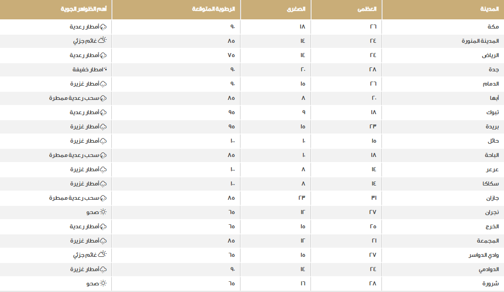 إذ تم التنويه على الأمطار الرعدية التي تتراوح شدتها ما بين المتوسطة والغزيرة تزداد فرص هطولها على كلٍ من؛ حائل، الحدود الشمالية، الرياض، تبوك، القصيم، المدينة المنورة ومكة المكرمة، كما تم الإعلان عن الإنذار الأحمر فيهم، أما عسير، جازان والباحة فمن المُحتمل سقوط الأمطار فيهم أيضًا.