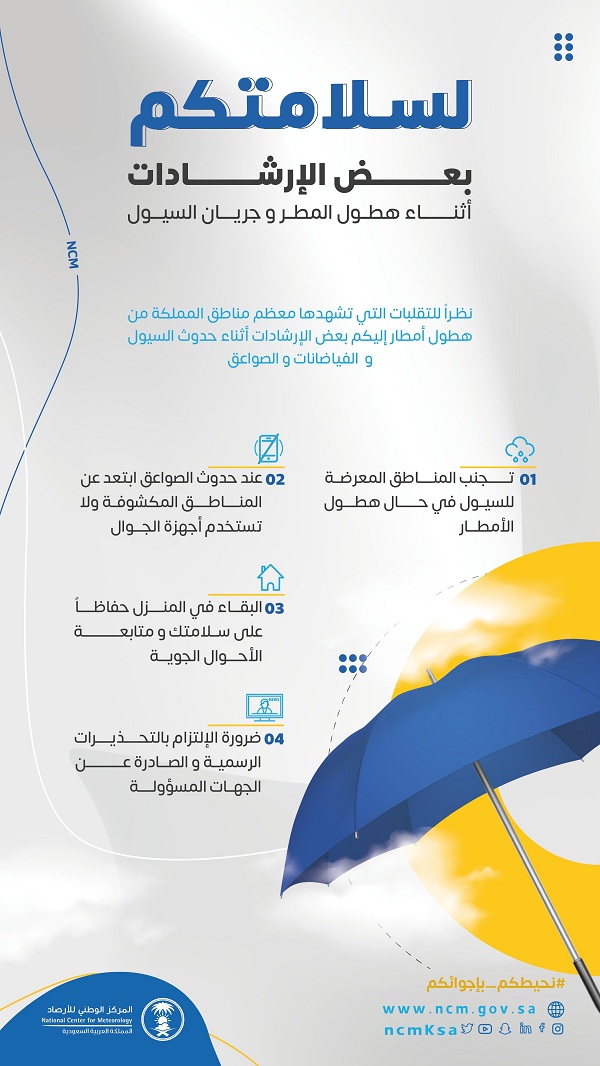 حيث قد أشار إلى حالة هطول الأمطار الغزيرة وجريان السيول وحدوث بعض الصواعق والفيضانات على بعض المناطق في المملكة، ومن الواجب على الجميع الالتزام بعدم الذهاب إلى هذه المناطق.