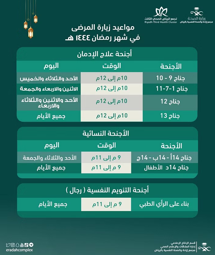 مجمع إرادة والصحة النفسية السعودي بالرياض أعلن عن مواعيد العمل الخاصة بالعيادات الخارجية وكذلك مواعيد الزيارات في شهر رمضان المبارك والرعاية الصيدلية، وذلك من أجل التيسير على المرضى المنومين والمراجعين وغيرهم من الأشخاص معرفة مواعيد الزيارة الخاصة بهم.