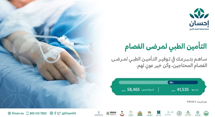 تدعو منصة إحسان السعودية من خلال الحساب الرسمي لها على تويتر جميع السعوديين القادرين ماديًا إلى التبرع لمرضى الفصام، وذلك من أجل توفير ما يناسبهم من تأمين طبي.