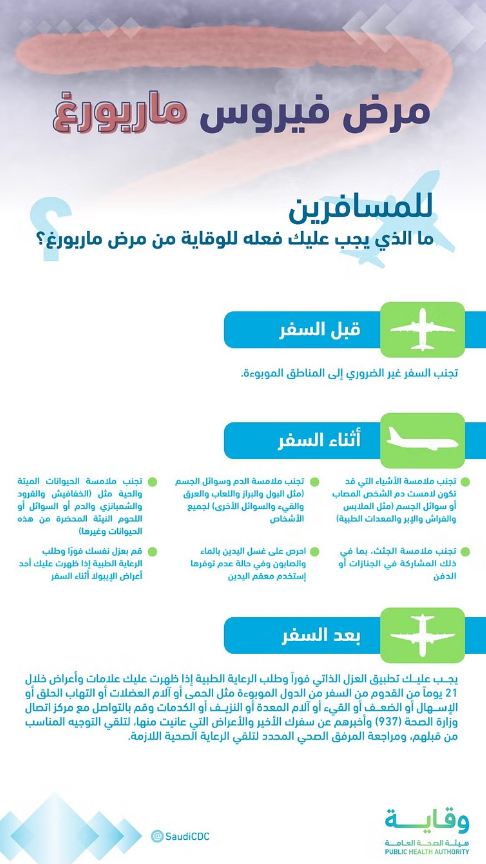 حيث طلبت ممن يشعر بأي أعراض من علامات مرض ماربورغ تطبيق العزل الذاتي على الفور، وذلك خلال مدة 21 يوم من العودة من دولة موبوءة.