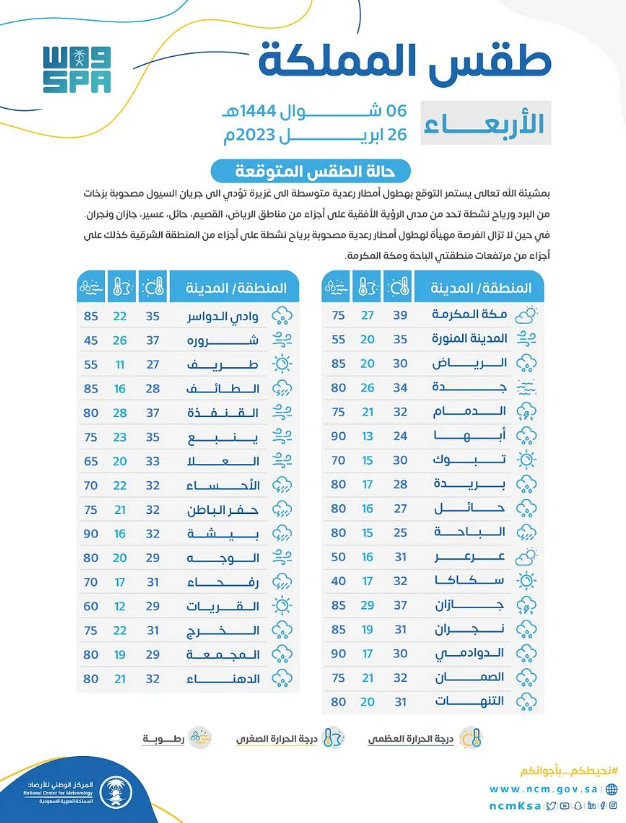 أوضح المركز الوطني للأرصاد بالسعودية درجات الحرارة العظمى والصغرى المسجلة في المملكة اليوم الأربعاء الموافق 26/04/2023م.
