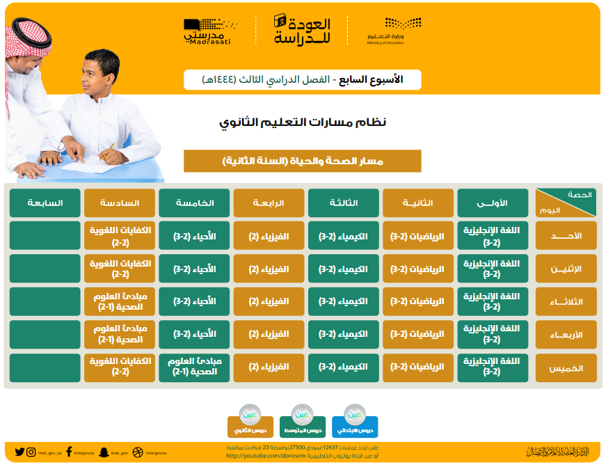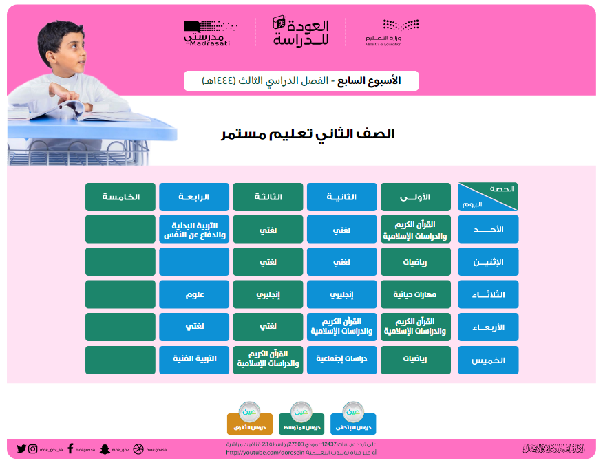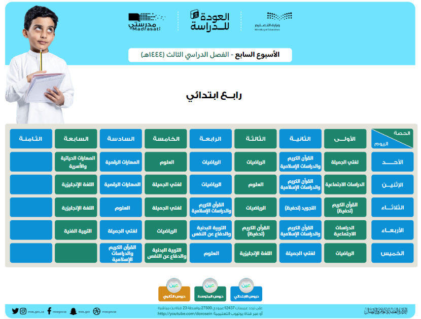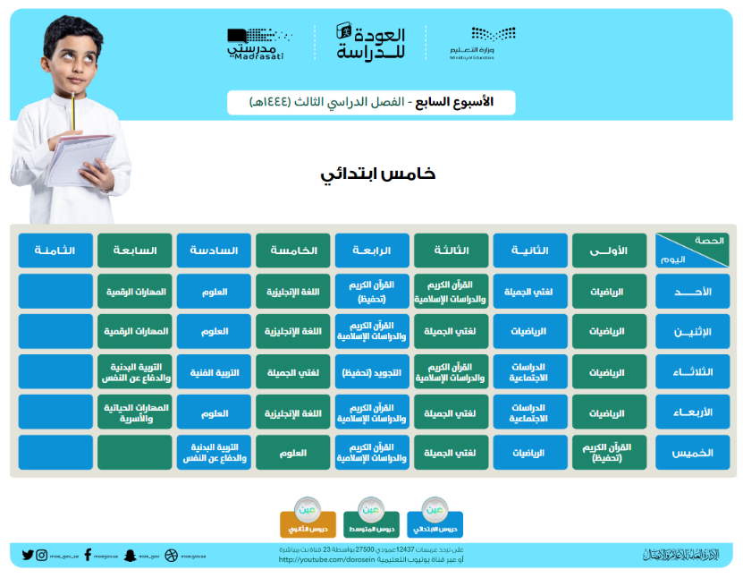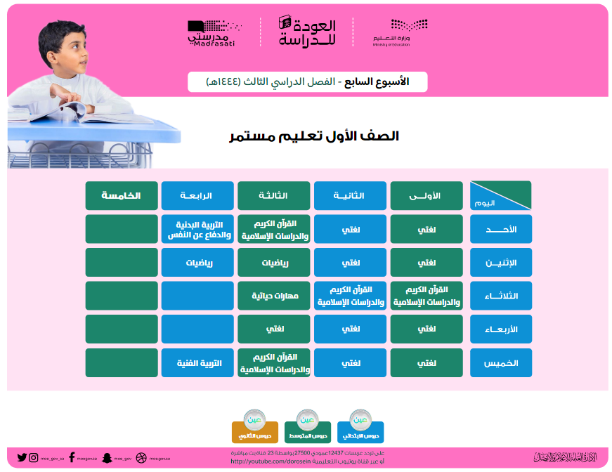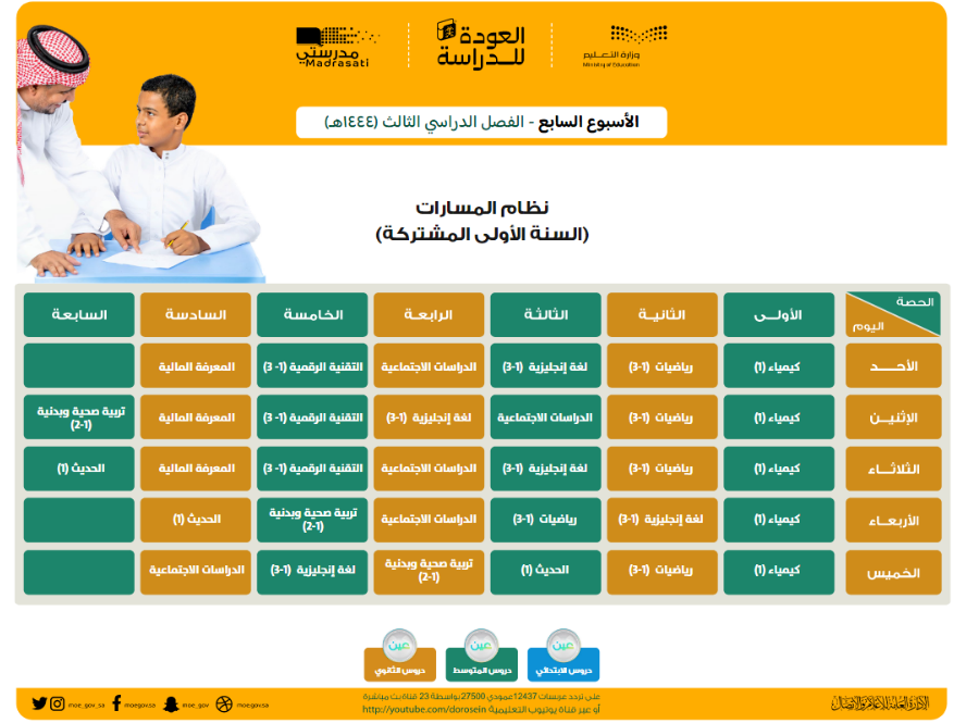وهو الجدول الذي تبدأ به الحصص في الصباح لجميع المواد الدراسية، وتُعاد على مدار اليوم على قنوات "عين" التعليمية ومن خلال منصة "مدرستي" أيضًا.