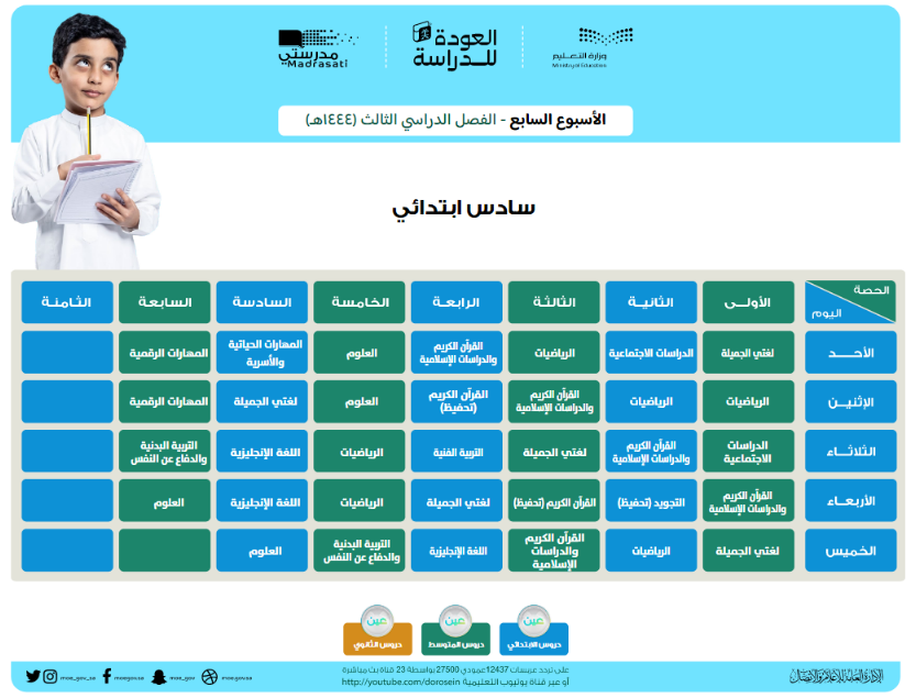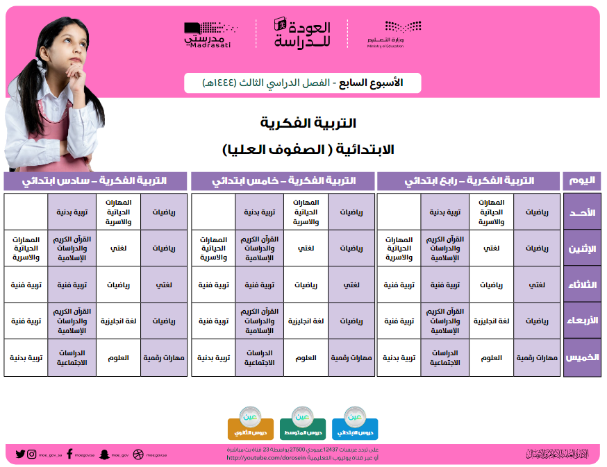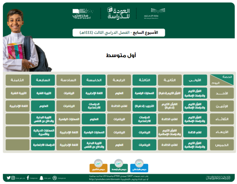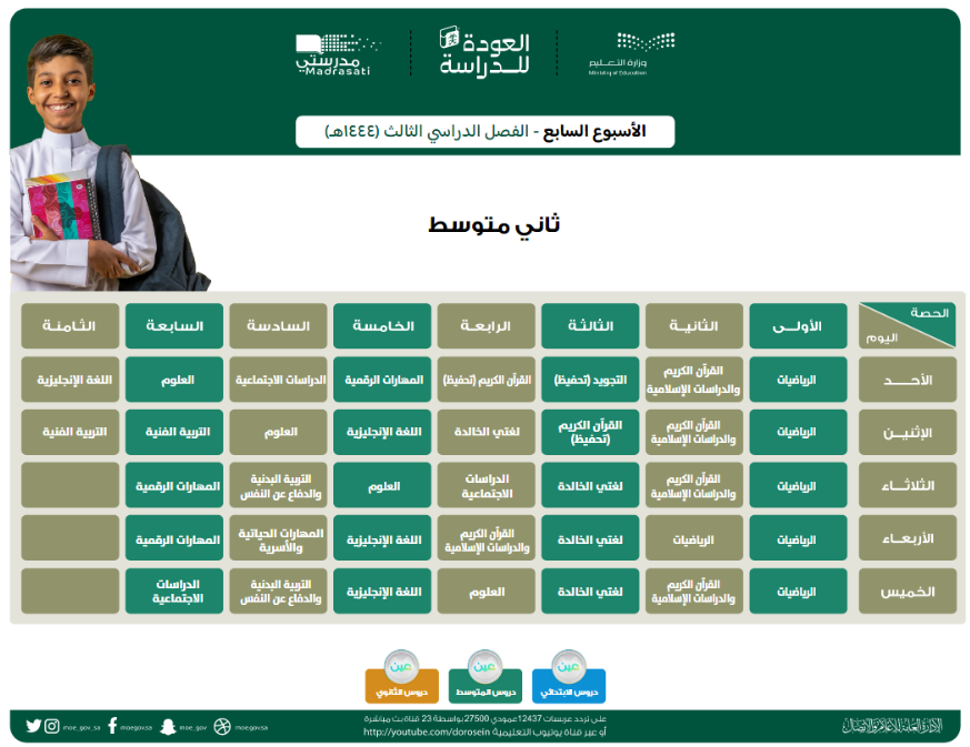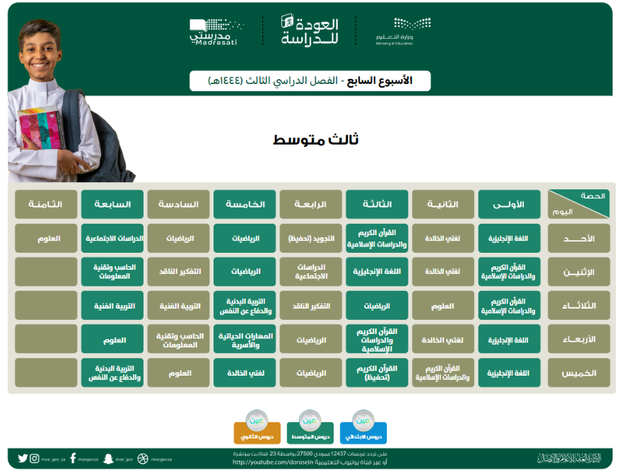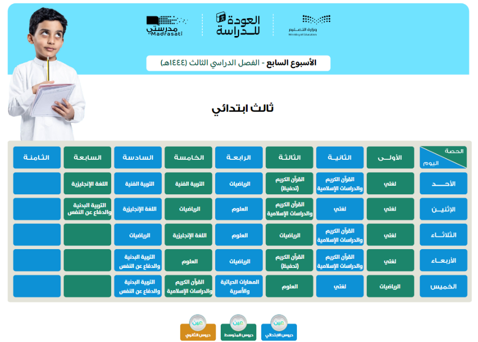 قامت وزارة التعليم السعودية بنشر جداول الحصص الخاصة بالأسبوع السابع الخاص بالفصل الدراسي الثالث لمختلف المراحل التعليمية.