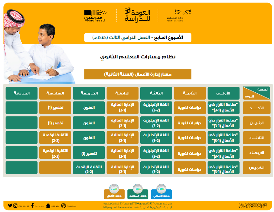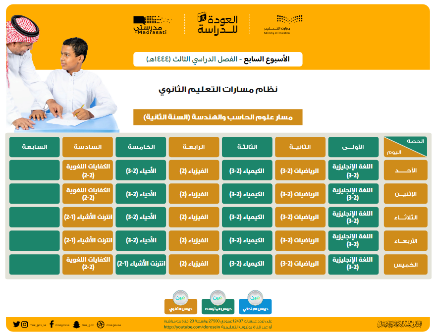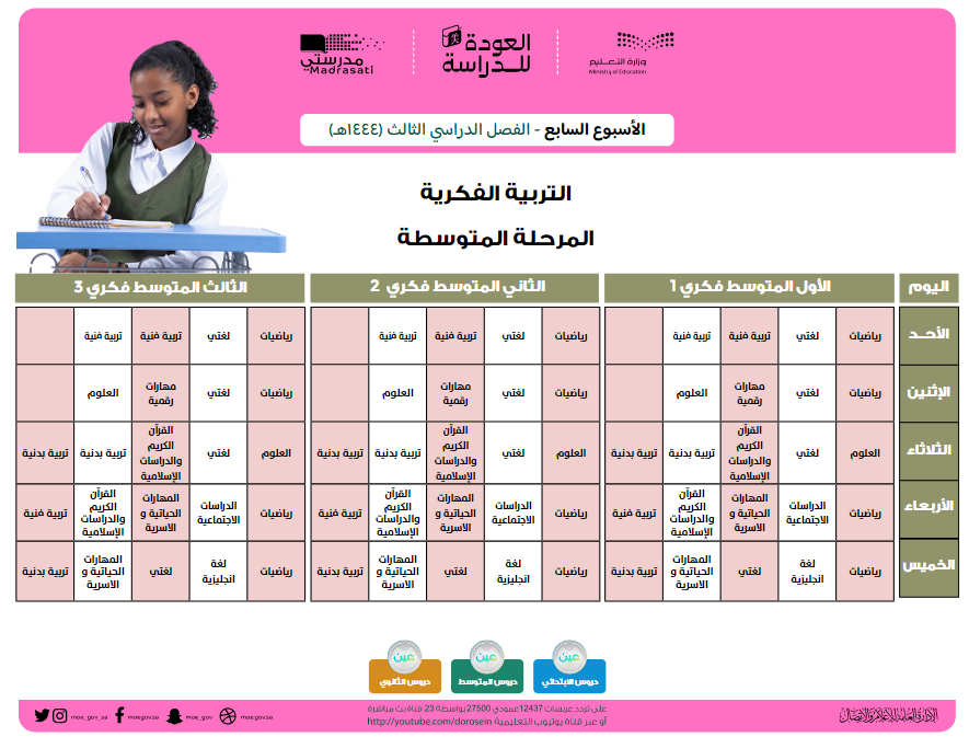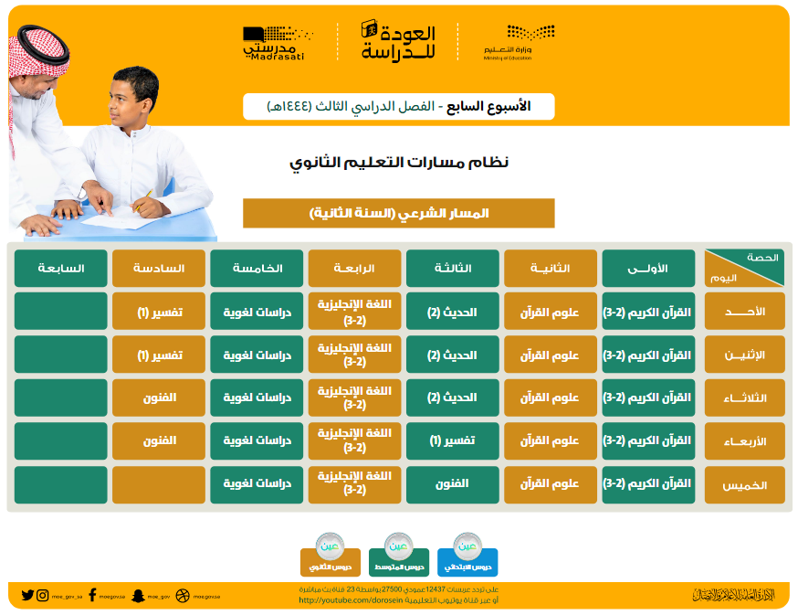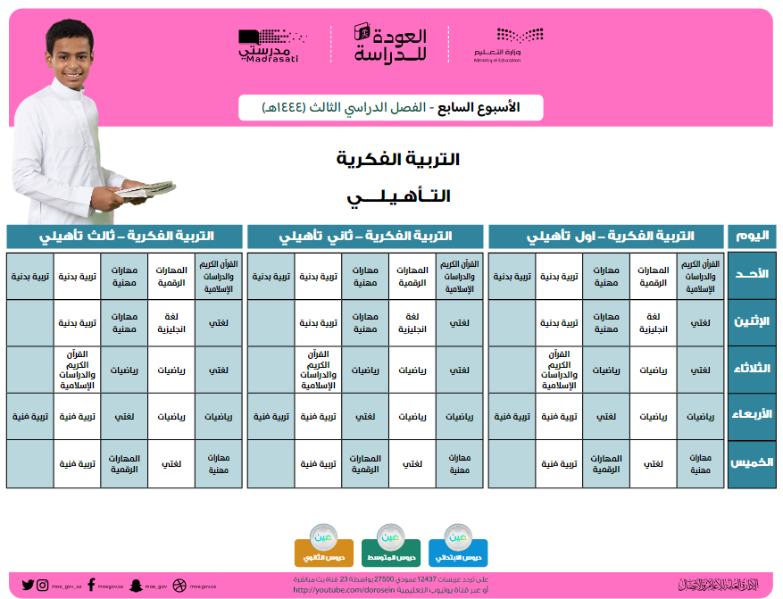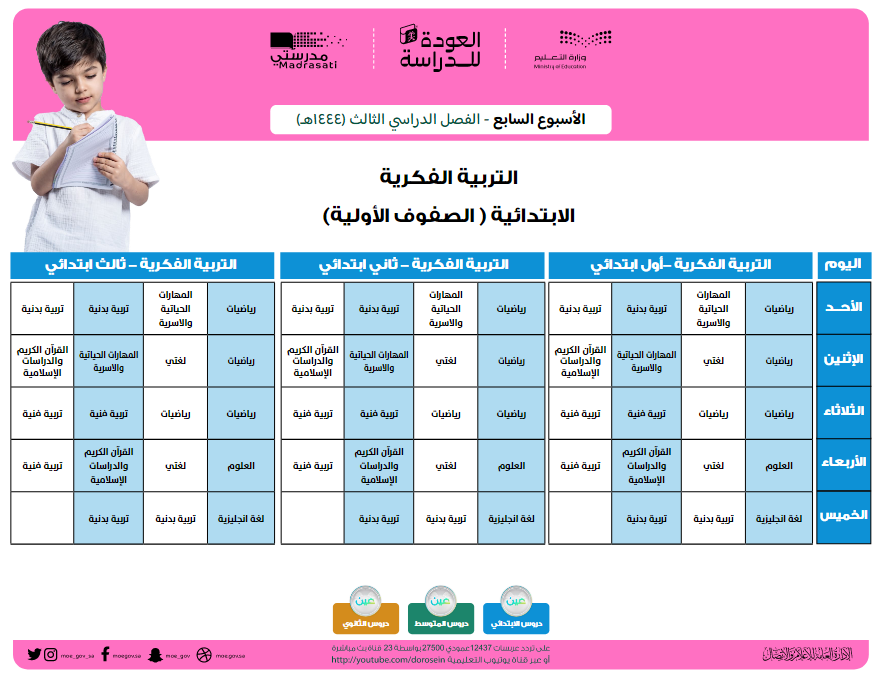 قامت وزارة التعليم السعودية بنشر جداول الحصص الخاصة بالأسبوع السابع الخاص بالفصل الدراسي الثالث لمختلف المراحل التعليمية.