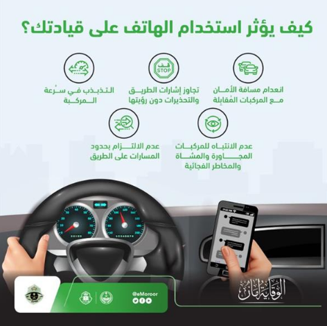 أعلنت الإدارة العامة للمرور بالسعودية عن بعض الإرشادات المهمة التي تقي قائدي السيارات من الوقوع بمخاطر وتوابع استخدام الهاتف الجوال أثناء القيادة، وقد أكدت من خلال هذه التعليمات على أن استخدامه أحد أبرز مسببات الحوادث على الطرق.