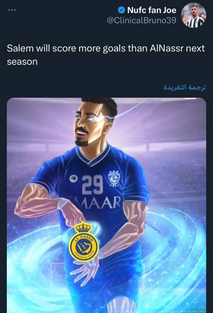 وفي هذه التغريدة ينتشر صورة للاعب الهلال سالم الدوسري، والتي علق فيها قائلًا: "سالم سيسجل أهدافًا أكثر من النصر الموسم المقبل".