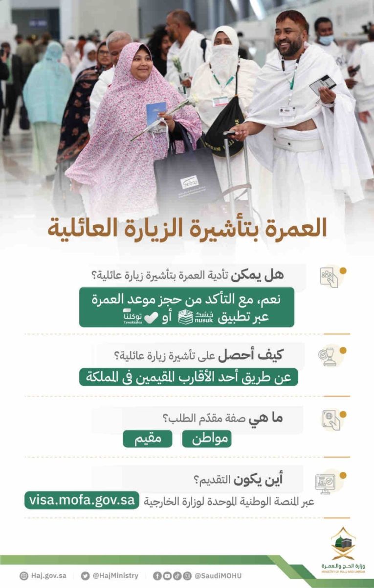يمكن لحاملي التأشيرة العائلية حجز موعد لأداء العمرة بسهولة من خلال تطبيق "اعتمرنا" أثناء زيارتهم لأقاربهم، وفقًا للمنصة الوطنية الموحدة للتأشيرات.
