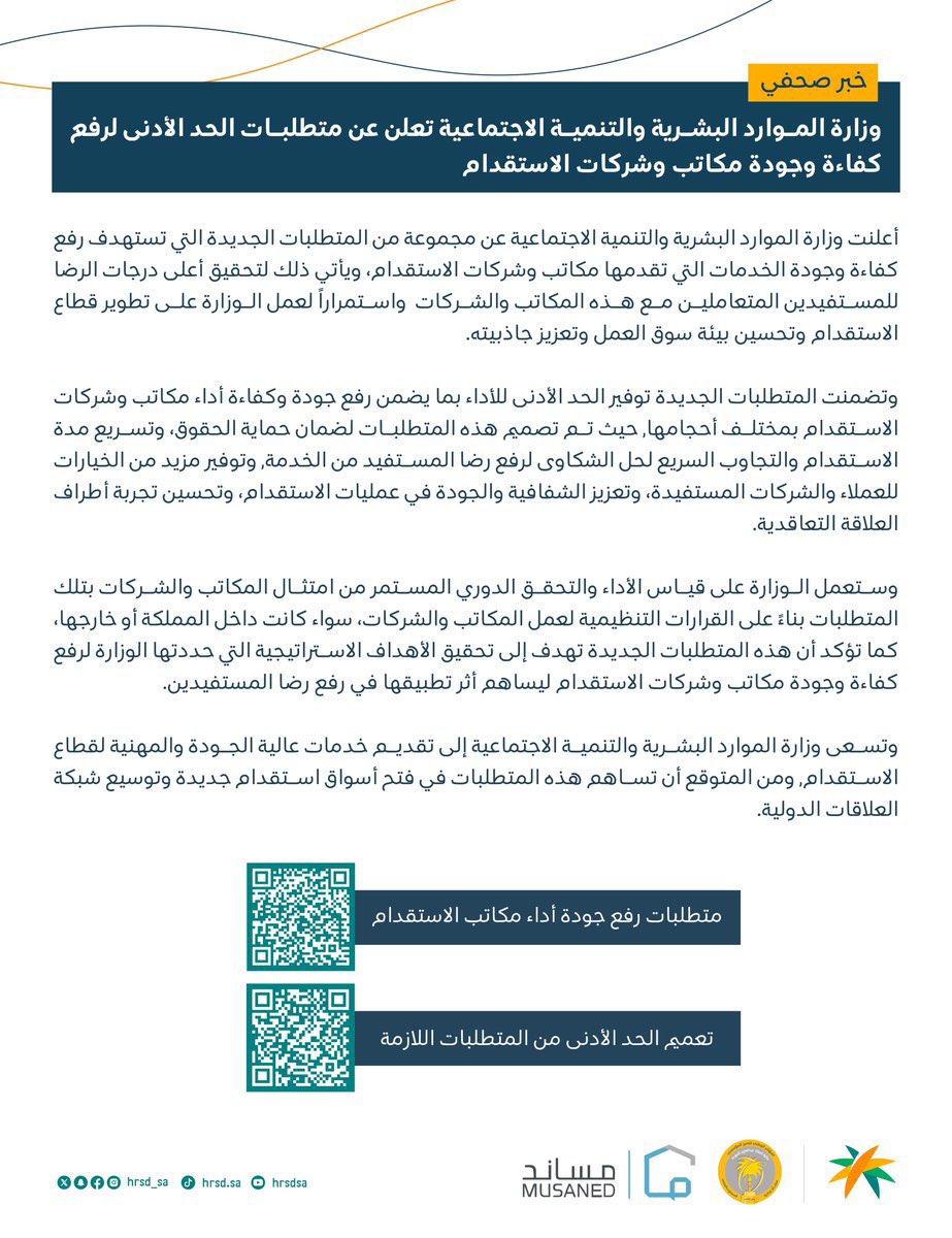 اعلنت وزارة الموارد البشرية السعودية عن متطلبات ومعايير جديدة لمكاتب وشركات استقدام العمالة في السوق وذلك بهدف تعزيز الشفافية ورفع الجودة في عمليات الاستقدام وزيادة الاحترافية، وتعزيز رضا المستفيدين والعملاء.