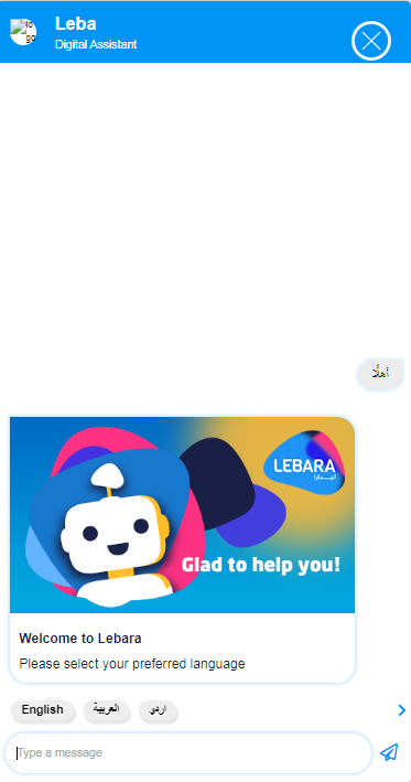 - عند اختيار اللغة يتم إكمال المحادثة، ويتم اقتراح بعض الموضوعات للاستفسارات.