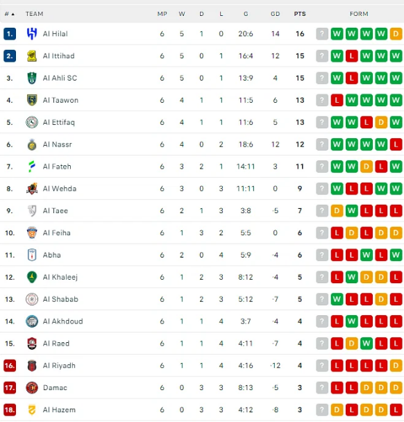 جاء في صدارة الدوري السعودي للمحترفين نادي الهلال، والذي وصلت عدد نقاطه إلى 16 نقطة وهذا على رأس جدول ترتيب الدوري السعودي للمحترفين، بعد الفوز الكاسح على الرياض بسداسية مقابل هدف واحد.