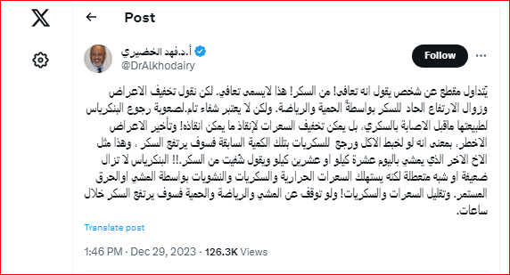 حيث قال بشكل صريح: "يّتداول مقطع عن شخص يقول إنه تعافى! من السكر! هذا لا يسمى تعافي، لكن نقول تخفيف الأعراض وزوال الارتفاع الحاد للسكر بواسطةً الحمية والرياضة".