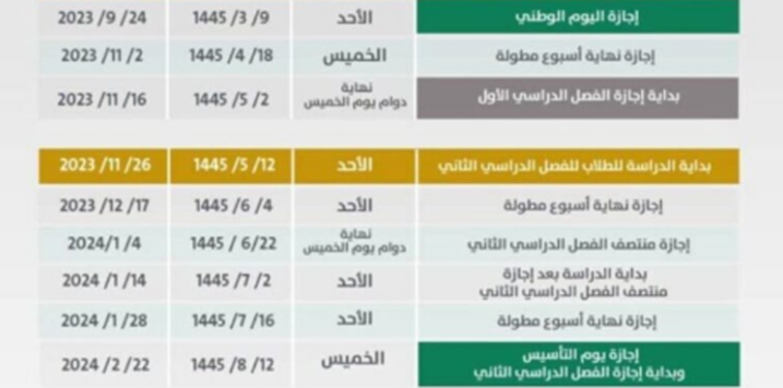 نتعرف من خلال الجدول التالي على موعد إجازات المدارس للفصل الدراسي الثاني 2024 ومتى تنتهي في المملكة العربية السعودية بشكل تفصيلي: