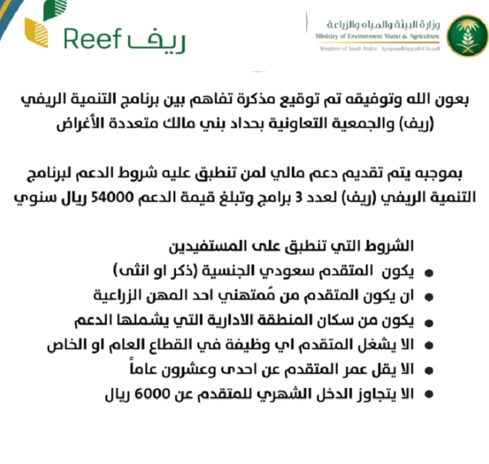 إلى هنا قد نكون استوفينا لكم العديد من الشروط ولطريقه المتاحة للتقديم في برنامج ريف الزراعي الذي تقدمه وزارة البيئة والمياه والزراعة بالمملكة العربية السعودية في إطار التطوير والتنمية المستدامة لمواطنيها.