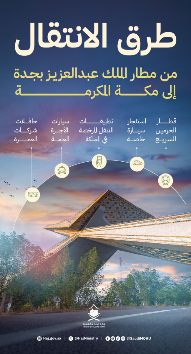 حيث استعرضت وزارة الحج والعمرة طرق الانتقال من مطار الملك عبدالعزيز في جدة وحتى مكة المكرمة عبر حسابها الرسمي على منصة إكس الرقمية حيث أوضحت أنه: "تختلف الوسائل وتتعدد الطرق، ولكن الوجهة واحدة والرحلة ميسّرة، تأخذكم من المنافذ إلى المناسك في يسر وطمأنينة".