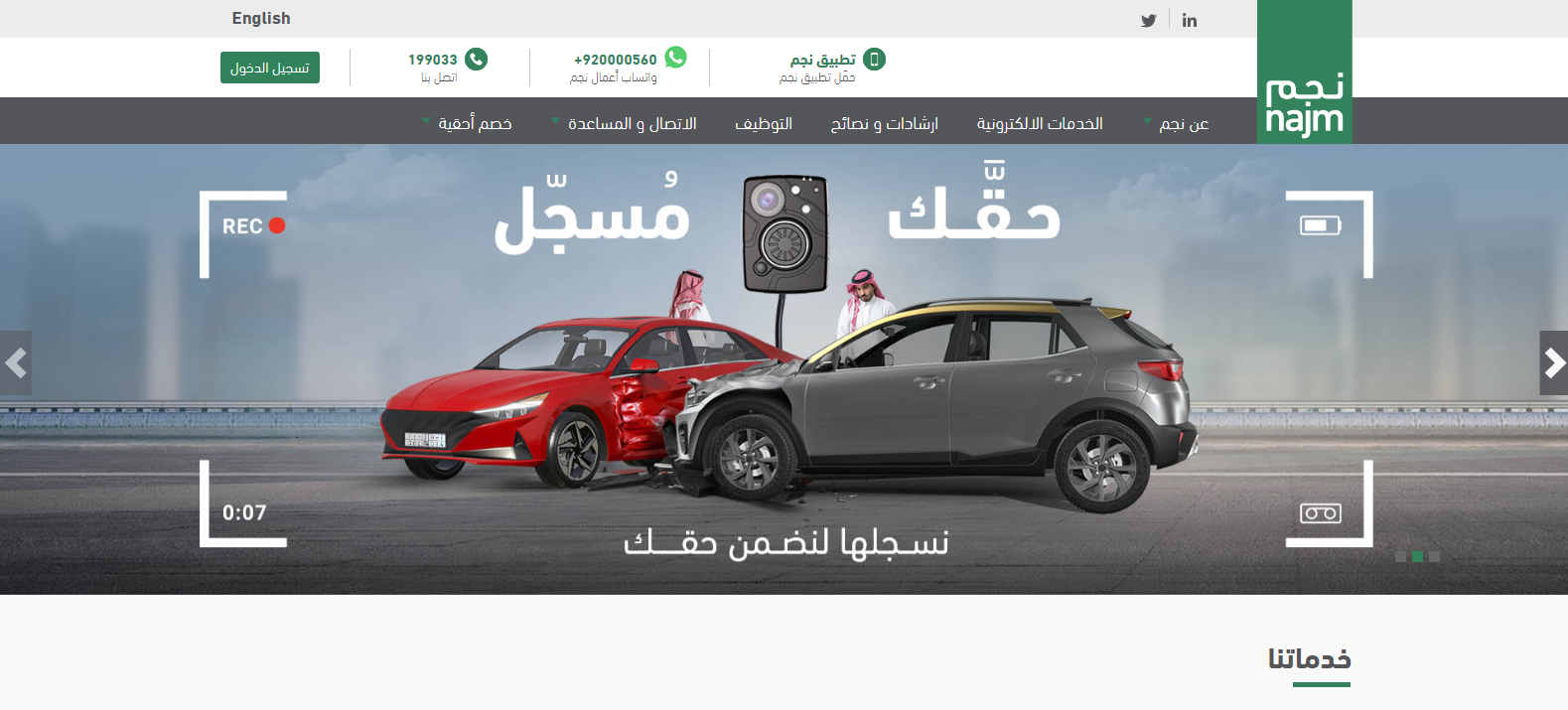 إن شركة نجم هي واحدة من أشهر الشركات التأمين في المملكة العربية السعودية والتي توفر عدد كبير من الخدمات الإلكترونية عبر التطبيق الخاص بها أو الموقع الإلكتروني مثل الاستعلام عن الحوادث أو رفع مطالبات وغيرهم.