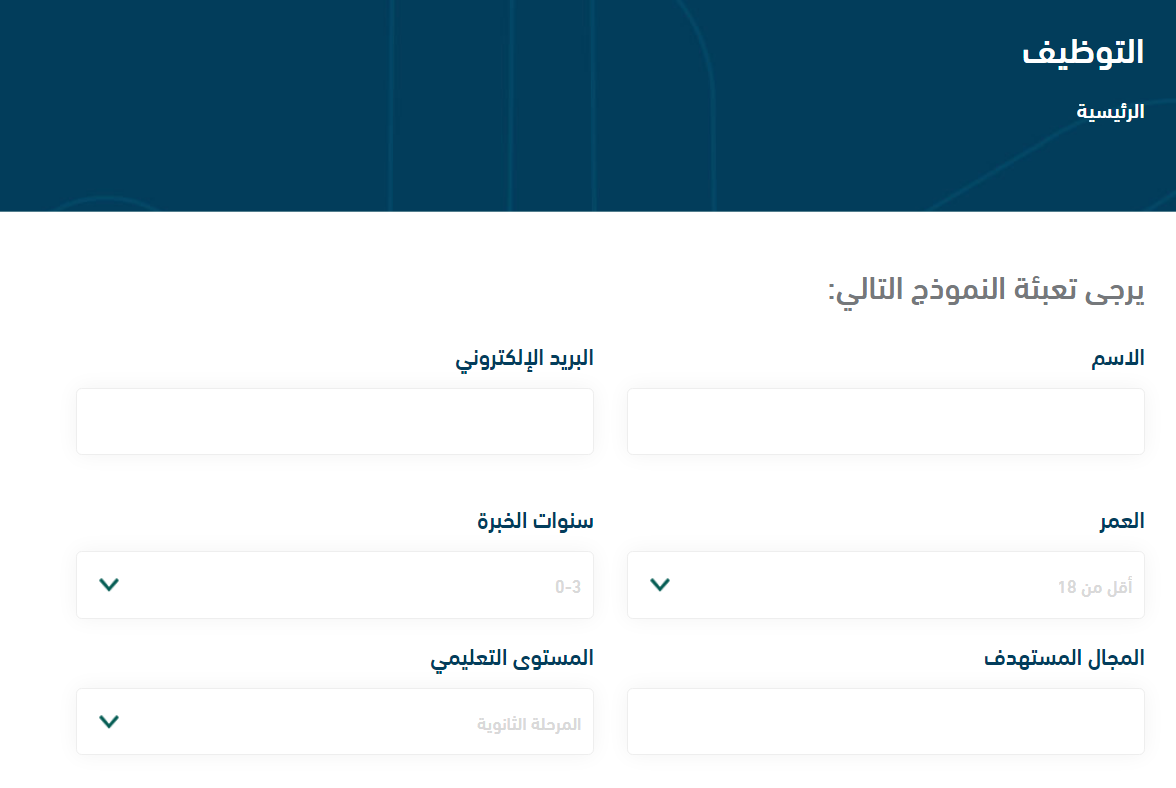 - تعبئة نموذج التوظيف بملء بيانات؛ الاسم، العمر، سنوات الخبرة، المجال المستهدف والمستوى التعليمي.