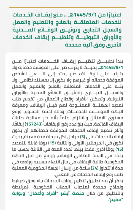 إذ تقرر في التعديلات المُستجدة أنه ابتداءً من تاريخ 1 رمضان 1445 هـ الموافق 11 مارس 2024 أن إيقاف الخدمات سيتم منع تطبيقه على الخدمات ذات العلاقة بكلٍ من؛ التعليم، العلاج، السجل التجاري، العمل، توثيق الوقائع المدنية والأوراق الثبوتية.