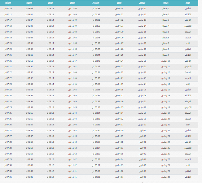 الجميع يتساءل عن مواعيد الصلوات في الشهر المبارك، وإليكم إمساكية الشهر الكريم التي تحتوي على جميع مواقيت الصلاة خلال كامل شهر رمضان المبارك: