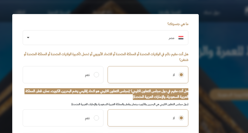 - قم بالإجابة على الأسئلة الآتية: هل أنت مقيم دائم في الولايات المتحدة أو المملكة المتحدة أو الاتحاد الأوروبي أو تحمل تأشيرة الولايات المتحدة أو المملكة المتحدة أو شنغن؟ - هل أنت مقيم في دول مجلس التعاون الخليجي؟ ).