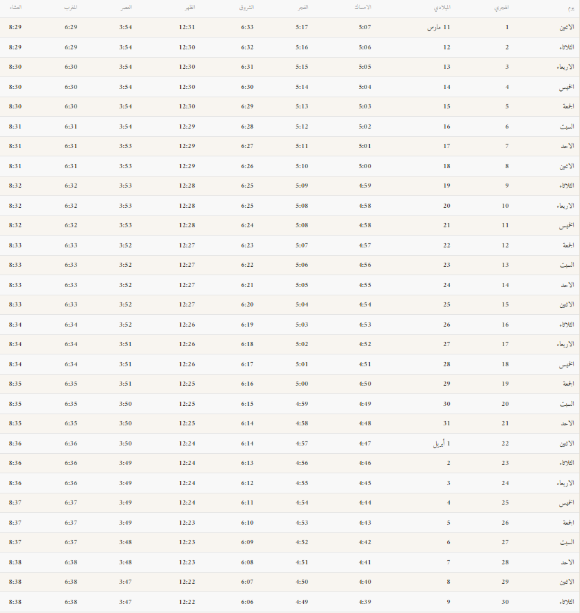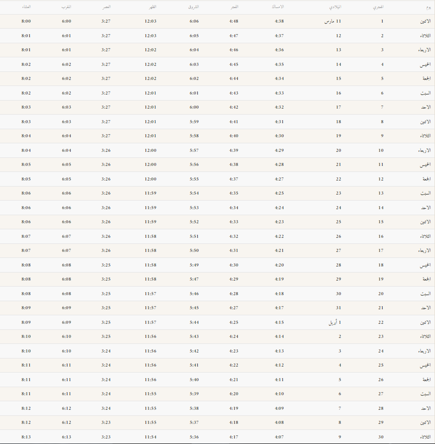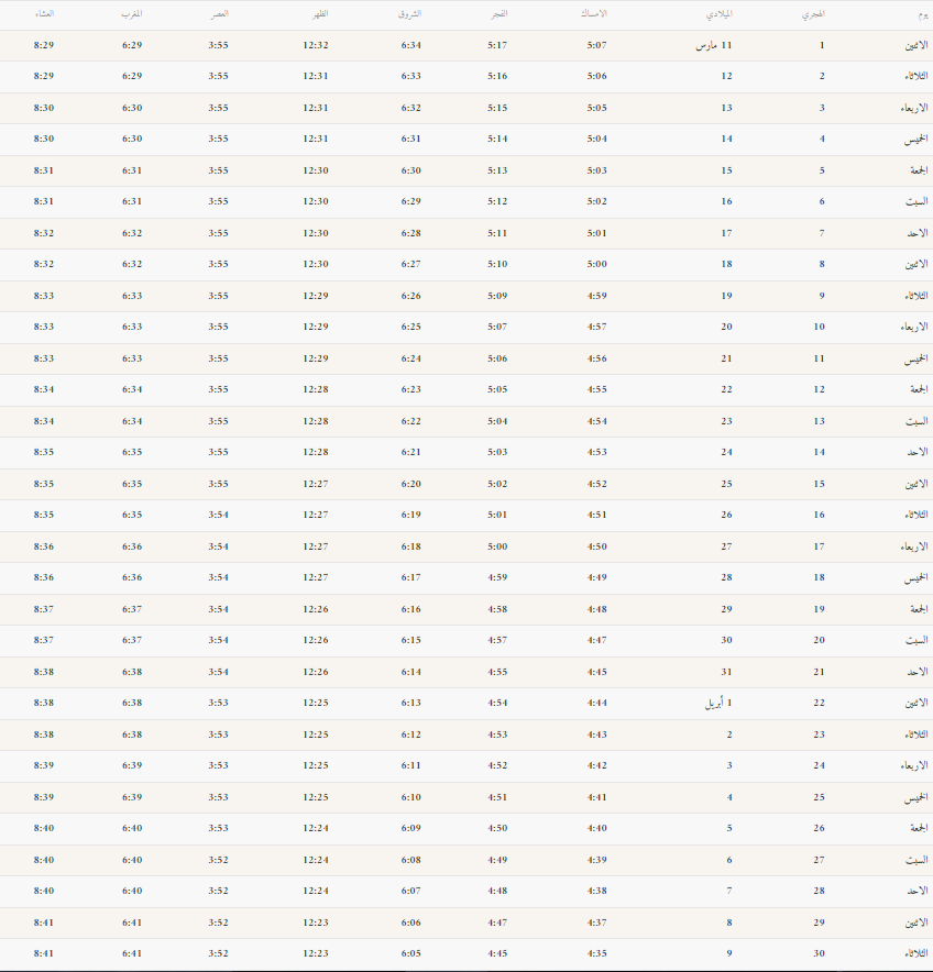 فيما يخص إمساكية شهر رمضان المبارك في مدينة الأحساء فهي ما تم إعلانها على النحو التالي: