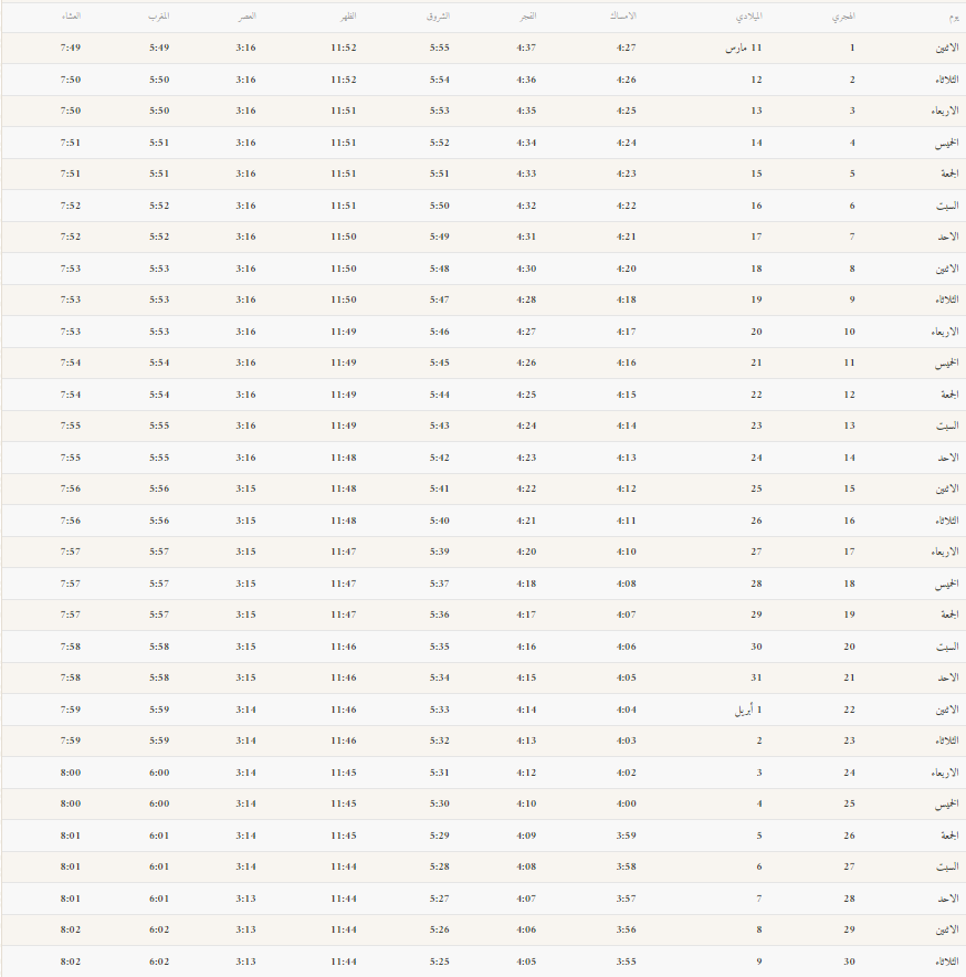 تتشابه إمساكية شهر رمضان المبارك مع مثيلتها في مكة المكرمة بشكلٍ ما، وهذا ما يتبين من مواقيت الصلاة الموضحة كما يلي: