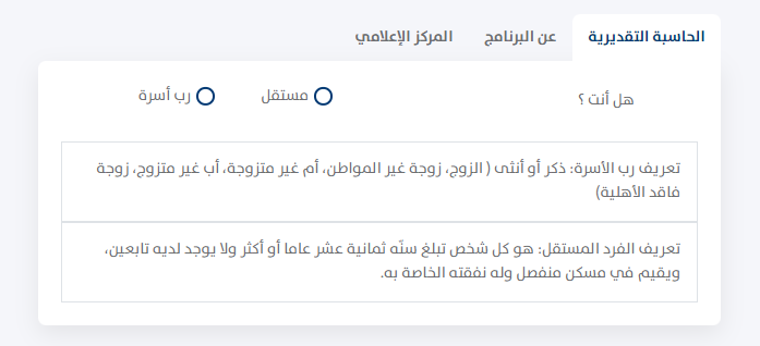 - ثم قم بالإجابة على الأسئلة المطروحة من حالة المستفيد هل مستقل أو رب أسرة.