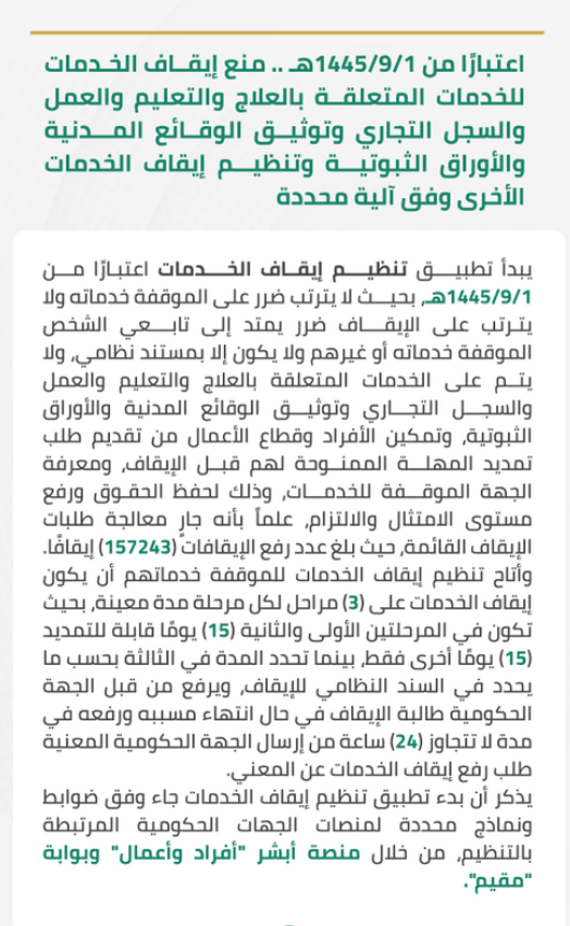 بشكلٍ رسمي وعلني كشفت الجهات المعنية في المملكة العربية عن قرارٍ مستجد متعلق بقانون إيقاف الخدمات، والذي يفيد بعدم تطبيقه بصورة تؤدي إلى إلحاق ضرر على الفرد المُعاقب ولا التابعين إليه وذلك من خلال منع إيقاف خدمات؛ التعليم، العلاج، توثيق الوقائع المدنية والأوراق الثبوتية، السجل التجاري والعمل.
