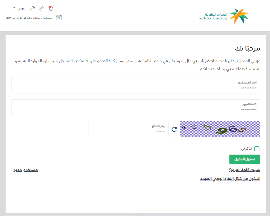 - تسجيل الدخول باسم المستخدم وكلمة المرور ورمز التحقق المرئي.