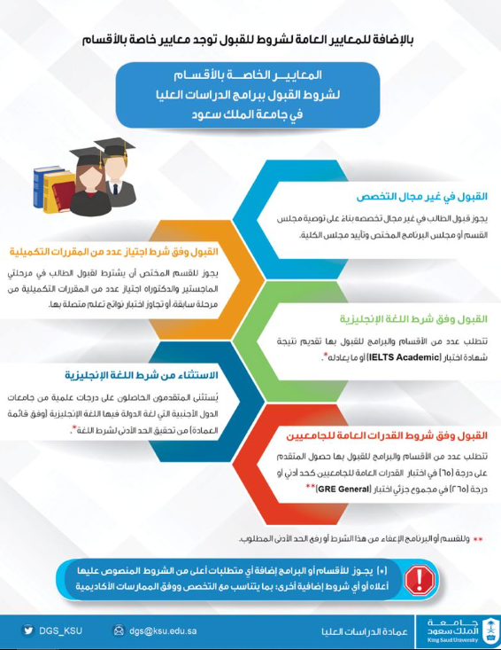 الراغبون في الولوج إلى طريق الدراسات العليا يكثر بحثهم عن جامعة مرموقة ينهالون من علومها وتساعدهم على المضي قدمًا في طريق النجاح، وفي هذا الصدد نشير إلى برنامج الدراسات العليا في جامعة الملك سعود التي وضعت شروط عامة للقبول تتمثل فيما يلي: