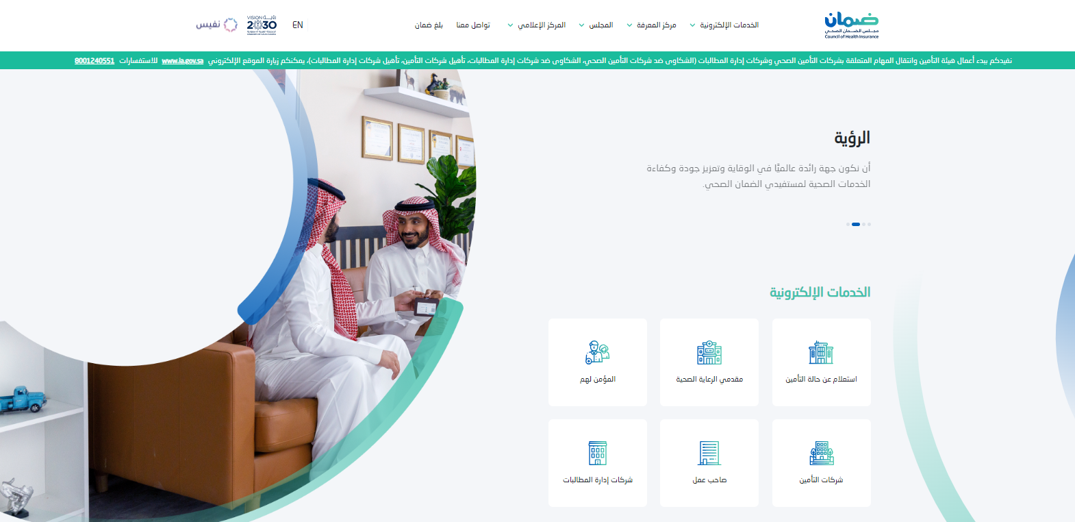 - من الصفحة الرئيسية لمنصة الضمان الصحي اختر "الاستعلام عن حالة التأمين".