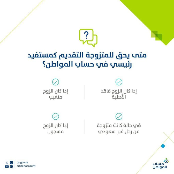 في سياق التعرف على العلاقة بين وظيفة الزوجة والاستفادة من دعم حساب المواطن وجب لفت الانتباه إلى تساؤل تطرحه الكثيرات من النساء وهو؛ هل يحق للمتزوجة التسجيل كمستفيد أساسي في البرنامج أم لا، أما الإجابة فنعم ولكن في الحالات الآتية: