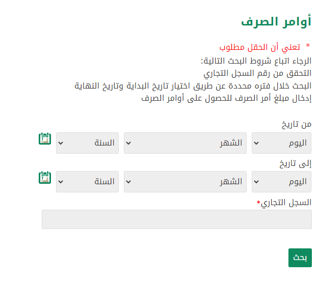 - يتم تعبئة الحقول الفارغة بالبيانات المطلوبة من التاريخ من وإلى رقم السجل التجاري.