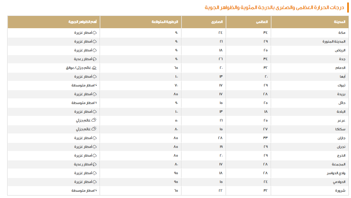 مع توجيه تحذير إضافي من الرياح شديدة النشاط التي تصل سرعتها إلى 60 كم/ ساعة، مع سقوط زخات من البرد والضباب الذي يجتاح نفس المناطق السابق، ومع كل هذا هناك انخفاض في الحرارة نذكره على النحو التالي: