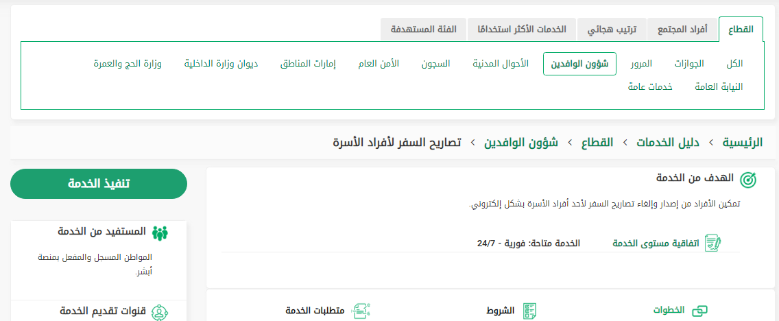 في النهاية يمكن الآن استخراج تصريح السفر لأول مرة إلى أحد التابعين في العائلة بكل سلاسة، وذلك يتم من خلال الموقع الخدمي الإلكتروني أبشر، ولكن قبل التقديم على طلب الخدمة يجب استيفاء كل الشروط والمتطلبات المحددة.