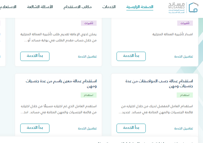 - انقر فوق بدأ الخدمة من استقدام عمالة حسب مواصفات من عدة جنسيات ومهن.