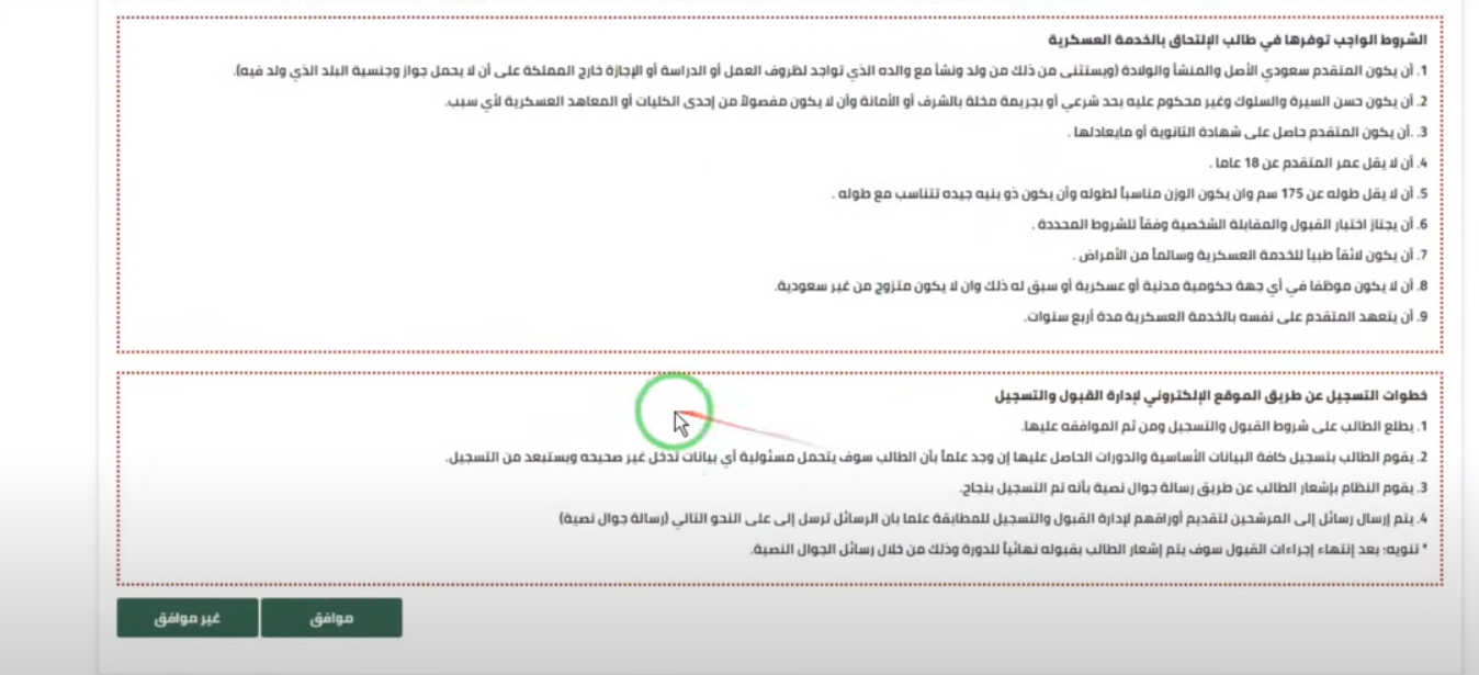 - يتم الاطلاع على سلسلة الشروط الأساسية للقبول والتعليمات الخاصة بالتسجيل ثم النقر على موافق.