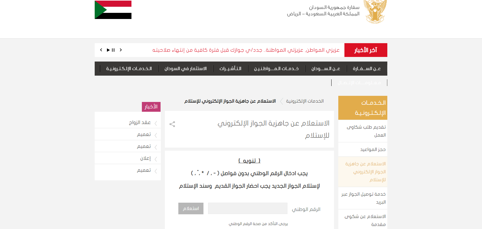 أتاحت السفارة السودانية في المملكة العربية السعودية خدمة الاستعلام إلكترونيًا عن جاهزية الجواز الإلكتروني للاستلام، وذلك من خلال اتباع الخطوات التالية: