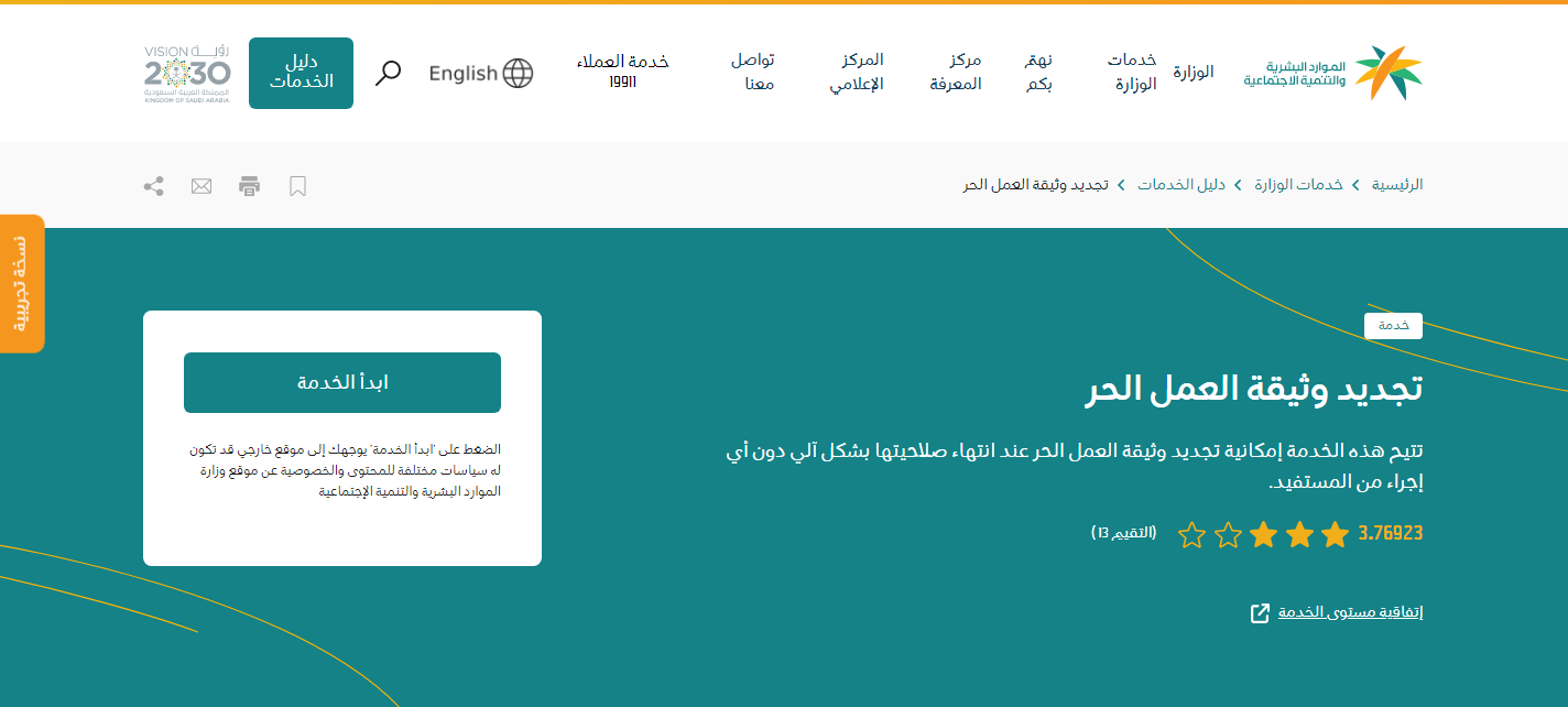 - اختر خدمة تجديد وثيقة العمل الحر.