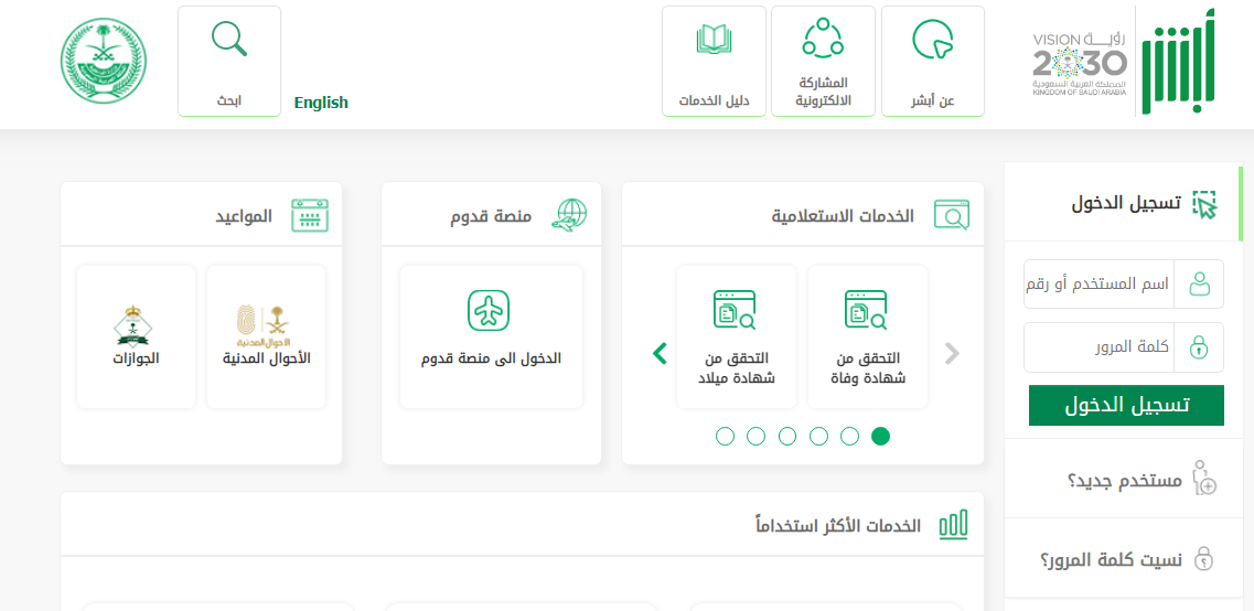 - الضغط على الرابط الرسمي لبوابة أبشر الإلكترونية.