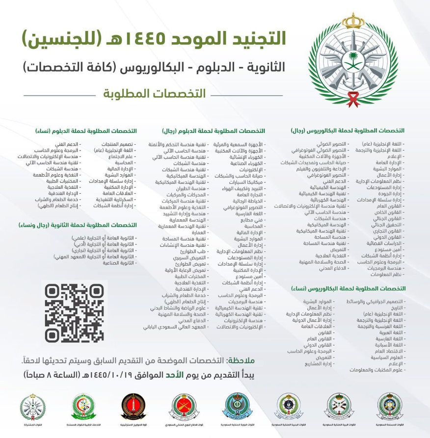 أعلنت وزارة الدفاع بالمملكة العربية السعودية عن فتح باب التقديم للتقديم على الوظائف المتاحة بجميع التخصصات بوزارة الدفاع ويكون الموعد يوم 19/10/1445 في تمام الساعة الثامنة صباحًا وأعلنت أن التخصصات المطلوبة لعدة مؤهلات فمنها لحملة البكالوريوس وحاملي شهادة الثانوية العامة والدبلومات الفنية.