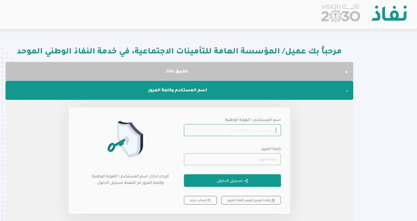 - سجل الدخول من خلال بوابة نفاذ الوطنية من خلال إدخال اسم المستخدم وكلمة المرور.