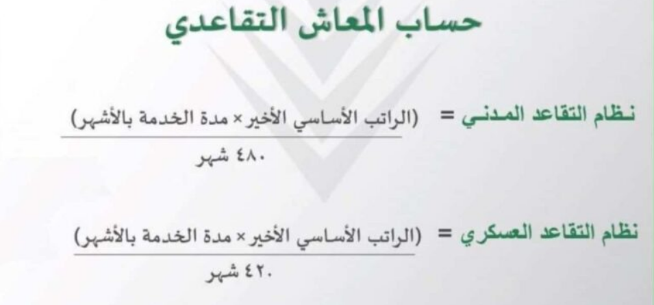 بعد الموافقة على طلب التقاعد العسكري إلى المتقدم يمكن الحصول على راتب المعاش المستحق، والذي يمكن معرفة قيمته بكل سلاسة وسهولة عبر عملية حسابية سهلة وبسيطة، حيث تكون طريقة حساب معاش التقاعد التأمينات الاجتماعية السعودية: متوسط الرواتب في آخر عامين من مدة الاشتراك × عدد شهور الأشتراك ÷ 480.