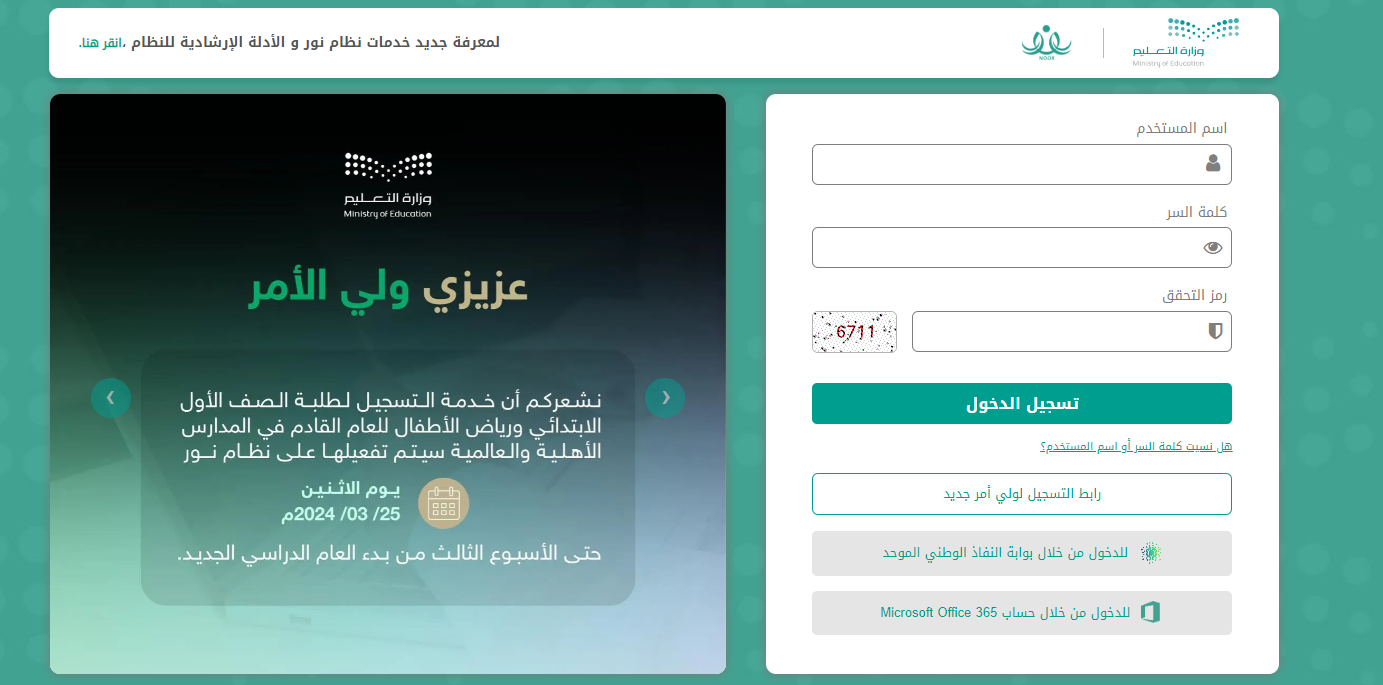 - يشترط أن يكون لدى ولي أمر الطالب حساب مفعل على نظام نور التعليمي الإلكتروني.