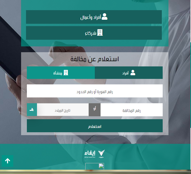 - أولًا قم بالذهاب إلى منصة المخالفات الوطنية الرقمية إيفاء.