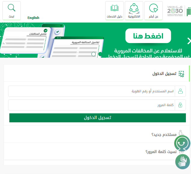 - اختر زر اضغط هنا للاستعلام عن المخالفات المرورية غير المدفوعة دون الحاجة لتسجيل الدخول.