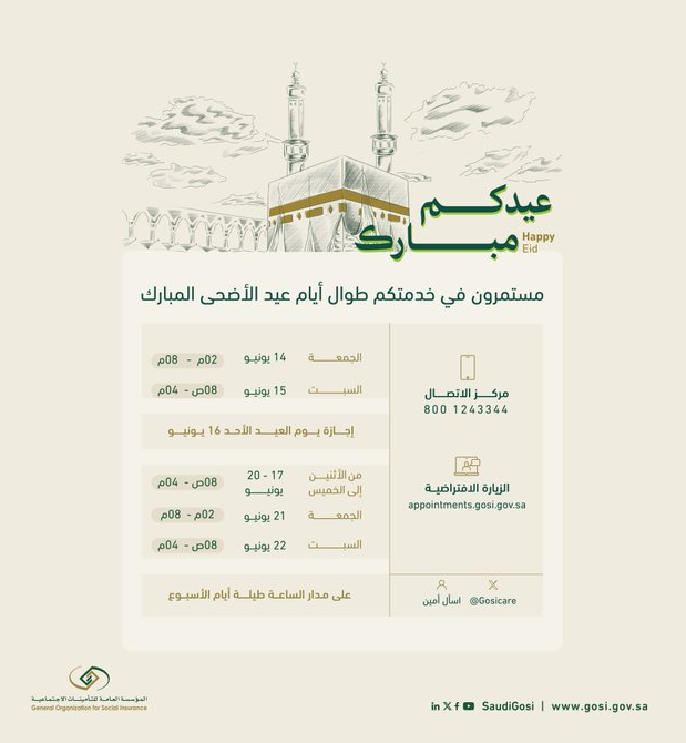 شاركت المؤسسة العامة للتأمينات الاجتماعية السعودية المواعيد الرسمية التي يمكن للمستفيدين التواص معهم خلال إجازة عيد الأضحى المبارك؛ وهي ما تبين أنها ستكون عن طريق مركز الاتصال، الزيارة الافتراضية وخدمة اسأل مين، وذلك على النحو التالي: