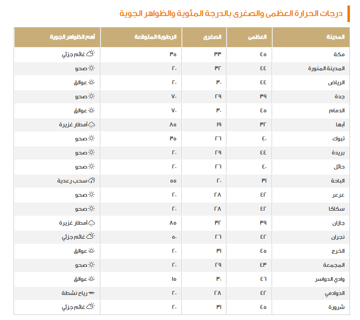 إذ تبين أن الأمطار والرياح النشطة بسرعة تتراوح بين 20 – 40 كم/ ساعة هما سيدا حالة الطقس في السعودية اليوم، بالإضافة إلى تنويهٍ خاص من توخي الحذر أثناء القيادة صباحًا لوجود احتمالات قوية بعدم القدرة على الرؤية على المستوى الأفقي بسبب الغبار والأتربة، وآخر ما سنقوم بالإشارة إليه هي درجات الحرارة اليوم على النحو التالي: