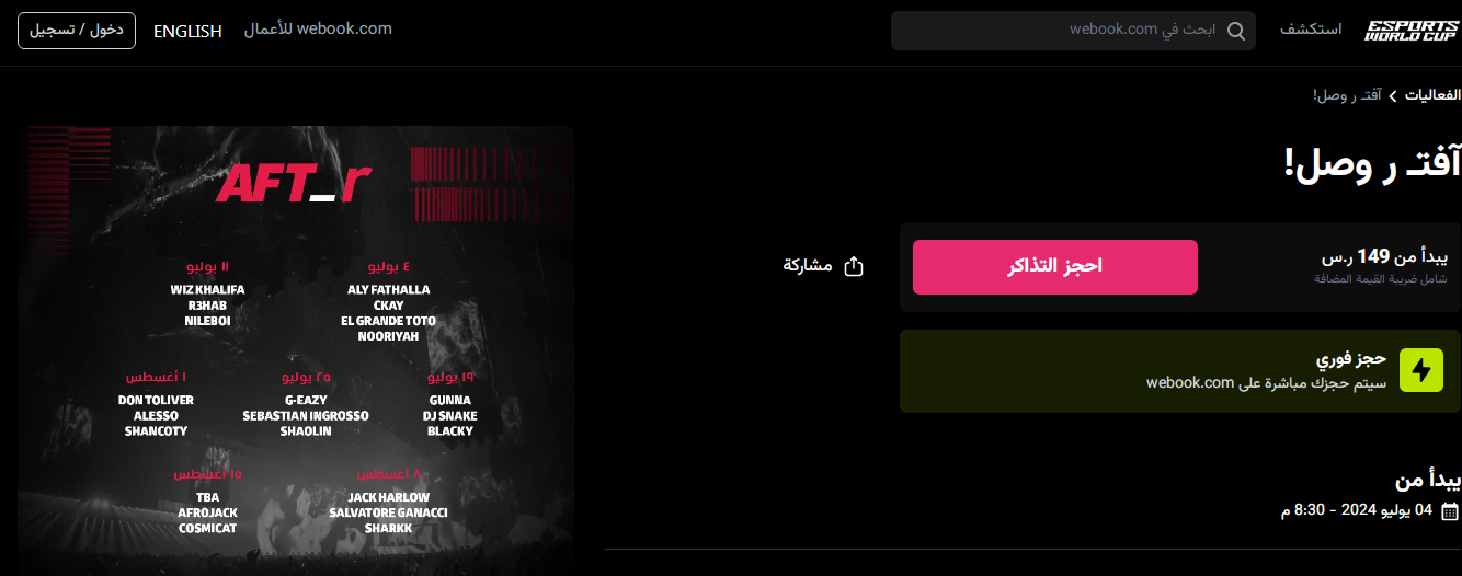 - قم بتحريك الفعاليات لمعرفة فعاليات أكثر، واختر الفعاليات التي تريد الحصول عليها، وانقر على "حجز تذكرة".