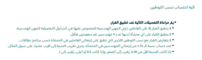 إذ تضمن هذا القرار أن تصل نسبة التوطين إلى 25%؛ وذلك من أجل خلق فرص وظيفية أكبر لكلٍ من المواطنين والمواطنات، الزجّ بأبناء المملكة إلى سوق العمل والحصول على مشاركتهم لتعزيز المنظومة الاقتصادية وأخيرًا زيادة نسبتهم في القطاع العام والخاص في المهن الهندسية على وجهٍ خاص.